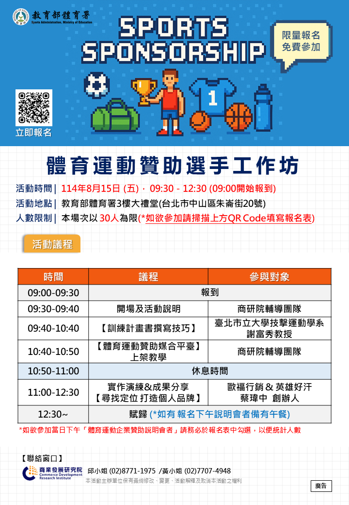 | 內容 | 為協助爭取民間資源投入體育運動發展,教育部體育署訂於114年8月15日(星期五)上午,辦理「體育運動企業贊助選手工作坊」臺北場活動,欲參加者,請依說明三於114年8月13日前填報活動報名表